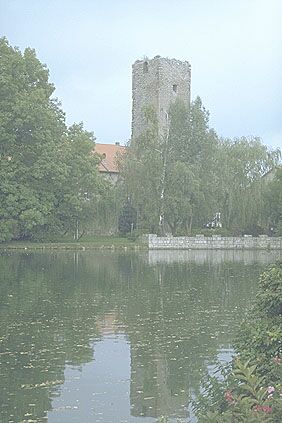 Die Niederungslage ermöglichte es, ein System von Wassergräben anzulegen. Ein Teil des äußeren östlichen Grabens bildet heute den Dorfteich. Der erste Turm bewacht den Eingang zur Vorburg.