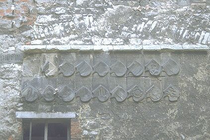 Im Innenhof der Hauptburg. Wappenreihen wie diese zeigen an, daß das Obereigentum bei einem Kollektivgremium lag. Hier stellt sich das Domkapitel von Halberstadt vor. |