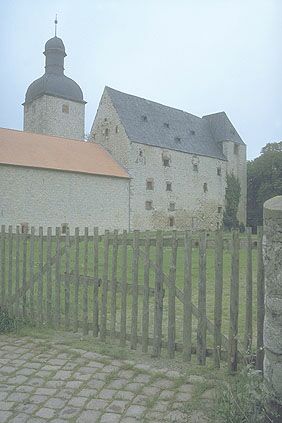 Der Palas von der Außenseite, Standpunkt nordwestlich der Hauptburg. Das Gebäude gilt als das größte seiner Art im gesamten Harzraum; es kann für die Geschichte des Burgenbaus einen besonderen Rang beanspruchen. Die Scheune links stammt aus sehr viel späterer Zeit.